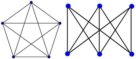 The following two graphs are known as the K5 and K33 graphs respectively. They are famously non-planar. How many edges minimum need to be removed from each to make them planar? (Hint: the two form a basis for all other non-planar graphs).