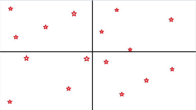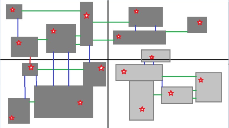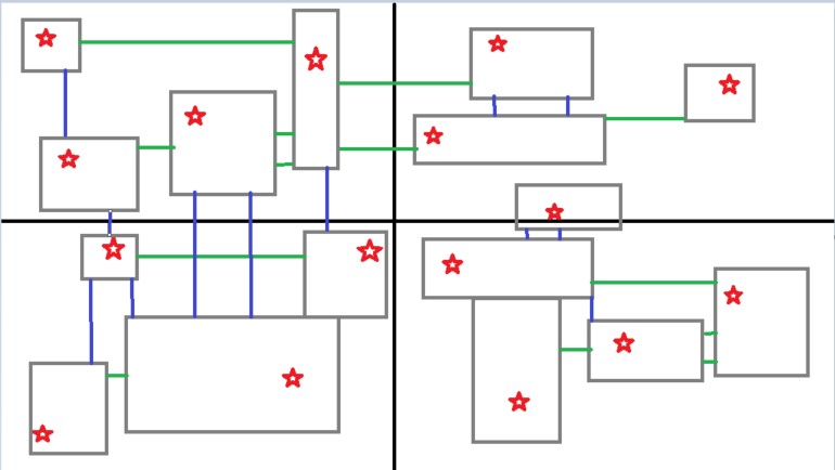 For starters, we needed to determine the number of rooms to create. This was achieved by using random selector over a uniform distribution from a range of 20 to 40 rooms. Throughout most of the project, we used selectors over uniform distributions with a min and max bound instead of a normal distribution. This was done in order to mitigate the small but problematic probability of generating an underwhelming single-digit number of rooms or even an erroneous negative number of rooms. The next problem was where to generate the rooms. We decided to place rooms based on reference point. All this means is that each room would start as a point and will be told to “grow” in a certain direction until it is told to stop by an external indicator. To ensure even room distribution, we split the window into quadrants, with the dead center of the window acting as the origin. Then, we generated random points within each quadrant until the number of points matched the number of rooms from determined from the first step. Points were as evenly distributed throughout the quadrants as possible. Using the quadrant partitioning method ensured a baseline level of acceptable room density. We did not want to have a generated world where the all the rooms were generated on the left side of the world for example.