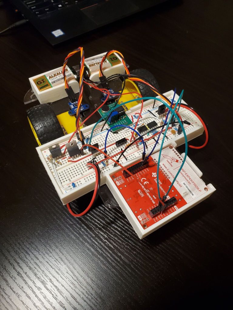 The controls aspect of this project did not involve the mic or vocal recognition in any way yet was a continuation of front-end circuitry. By controls, I simply mean making the car go straight and turn right / left at a reasonable radius of curvature without overshooting. Otherwise basic tasks for a servo motor, this was made ever more difficult by crap motors. First of all, I had to install my own encoders and photogates to read the rotational speed of these motors. After all the necessary circuits for motor control and tick reading were implemented on the breadboard, the real work began. First, I ran simple calibration tests that determined the base rotational speed of each motor given a range of voltages. Next, in the Launchpad, I implemented a closed-loop control scheme. In general, the scheme involves using the difference in wheel rotational speeds and multiplying this difference by a k-factor to determine the necessary adjustments in speed of each wheel upon the next discrete timestamp. To go straight, the car would adjust wheel rotational speeds with a target difference of 0 ticks/second. To turn right or left by a certain radius, the target difference in wheel speed was adjusted to a nonzero value based on some basic kinematic equations. The car has learned to walk.