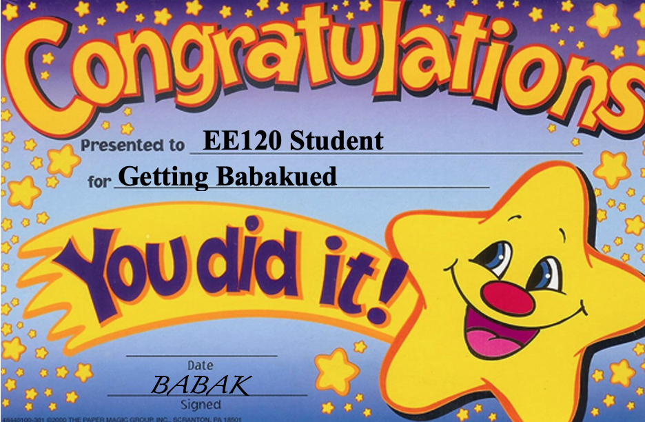EE 120 was an oddly structured course. There were 4 total hours of lecture weekly, which was the most I have ever heard of in a college course. One single discussion section covered topics at a high level of difficulty, but with guidance. But most interestingly, there were labs assigned throughout the semester with no designated lab section to complete them. As a result, they replaced the tediously long yet typical 30+ page homework assignments on the weeks they were assigned, giving us a much-needed break to do some coding and real-world signal processing instead of number crunching. What really made the course great was Professor Babak. Endlessly knowledgeable, intentionally funny, clearly passionate, and with a genuine desire to relate to the students, Babak is a man of the people, or should I say a “professor of the students”. Sure he gives lengthy sets and difficult exams that leave you Babakued, but he also sparks excitement towards an often difficult topic, which students will take away long after the Fourier Series has left their memory.