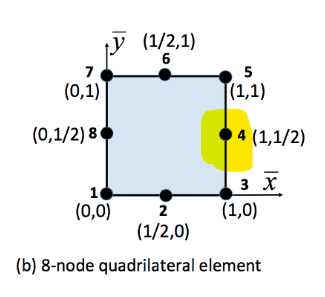 Below is an 8-node square element, the most common type of element used for its balancing of runtime and accuracy. Each node on the element must be associated with a “shape function” that holds the Kronecker property: the function must evaluate to 1 at the node it is associated with and 0 at all other nodes. What is the shape function of the highlighted node?