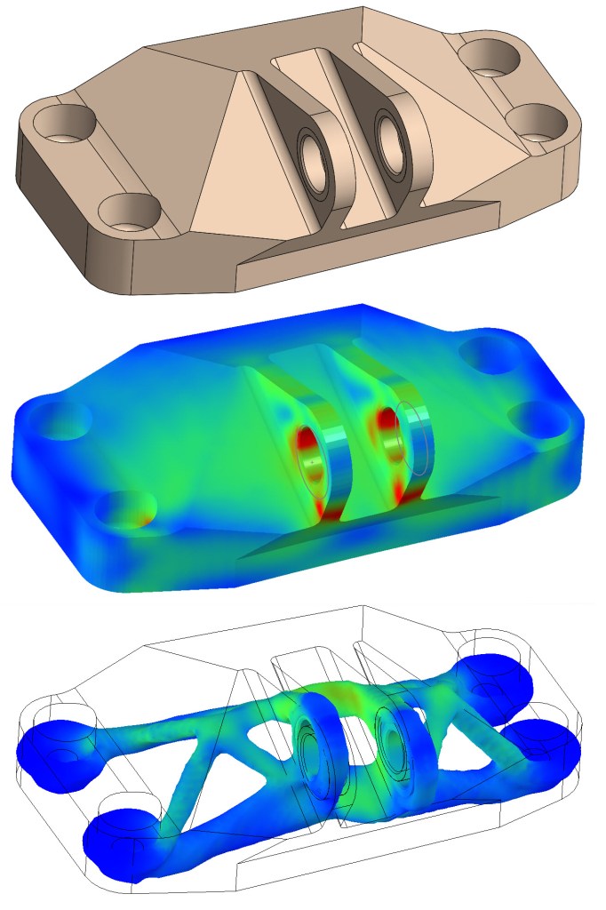 Without further to do, here’s my run through of the curriculum. The first third of the class sought to introduce us to the basics of how a finite element model is set up. We covered strong form equations (typically the physical law) and how the weak and minimization forms were derived from the strong. We also covered test and trial functions, both of which were necessary for the derivation of the weak form and are also where the finite solution spaces come into play. To wrap up the basics, we covered the Dirichlet (essential) and Neumann (natural) boundary conditions as well as the location matrix (the key to going from element-by-element solutions to a full-body solution). With that, any finite element problem is fully defined. The second third of the class was a round-robin style coverage of all the different types of problems that the methods we learned in the first third could be applied to: static stress analysis, fluid dynamics, heat transfer, oscillatory modes, the list goes on. The last third of the class focused on optimization and using the FEM to do more than just analysis but also to help in the design process. Imagine simply defining loads on a block of material, defining a maximum material quantity, and watching the computer cut away at the block until the optimal design has been reached. Behold, topology optimization, powered by FEA.