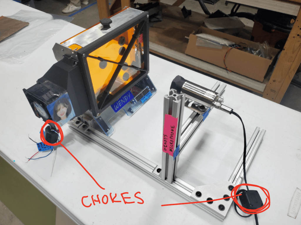 While building Wendy, however, I finally came face-to-face with this beast. Thanks to the high power and switching frequency of the inverter, that thing was an electromagnetic minigun, spewing enough noise to disrupt basically any unencoded signal in its vicinity, wired and wireless. Thankfully, because bluetooth and i2c signals are engineered well, I was still able to listen to Red Velvet and the signal line between my air flow sensor and my central Arduino still worked like a charm. The problems arose in the fan tachyometer and the digital read out for the airspeed. It took me hours of head scratching to figure out why my fan was not responding as expected to the input PWM signal, and why my airspeed digital read out would display gibberish after the power to the inverter was ramped up past around 50%. The solution at the end of the day? To quote Leo my coworker “When in doubt, choke it”.