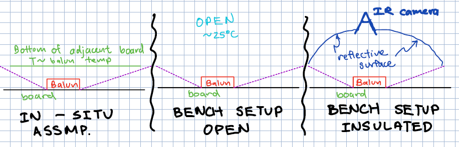 Another huge question I had to ask myself was whether radiation heat transfer was a negligible factor. In-situ, the inverter boards would be enclosed by either aluminum or by the backside of another inverter board of comparable temperature. With Wendy, the inverter board is enclosed by a practically transparent film of food wrap, which would sink much more heat radiatively. The sketch below illustrates this concern, as well as an initial proposed solution for fixing it in case it was necessary.